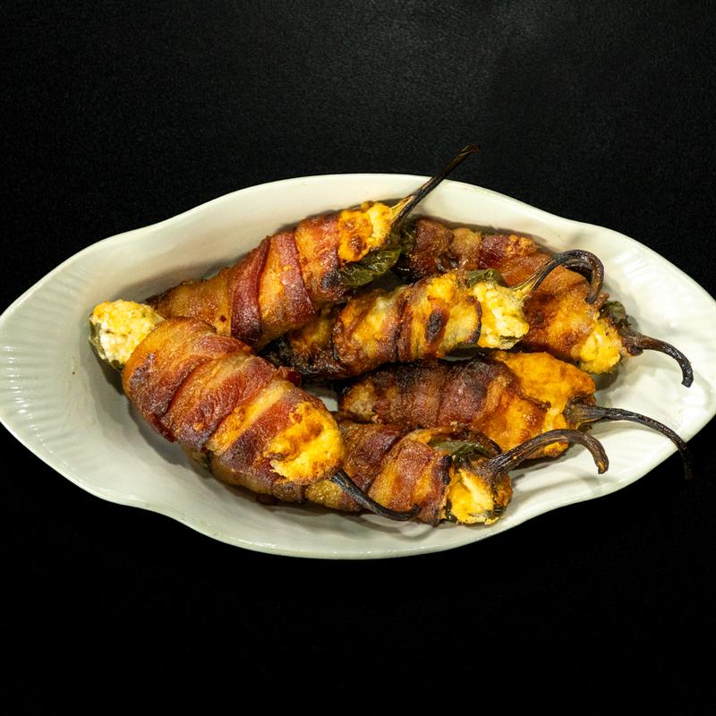 Jalapenos stuffed with cream cheese and wrapped in bacon